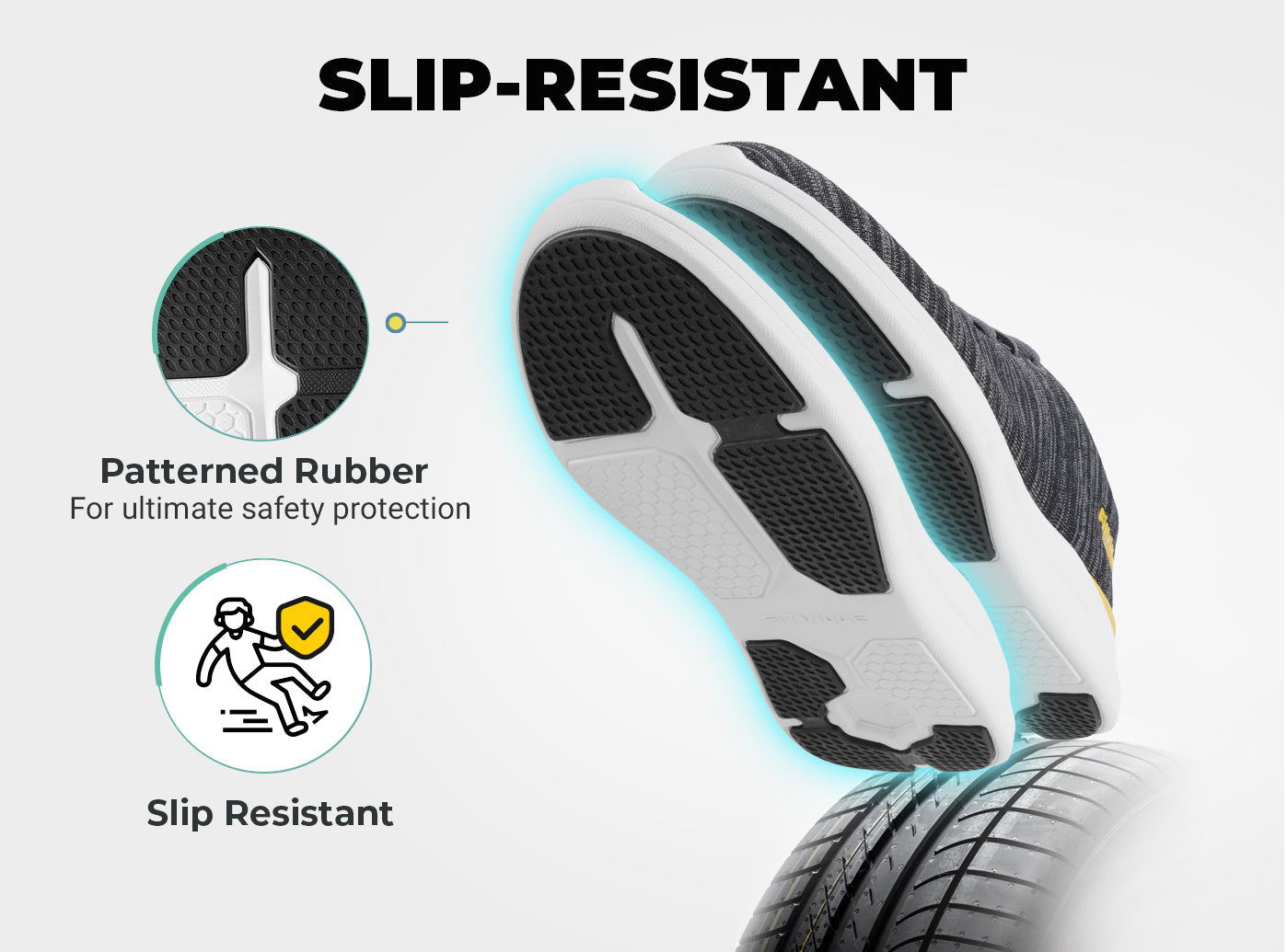 The sole consists of a high rebound EVA sole that provides stable arch support and shock reduction, with a concave-convex slip resistance pattern on the bottom for ultimate protection.