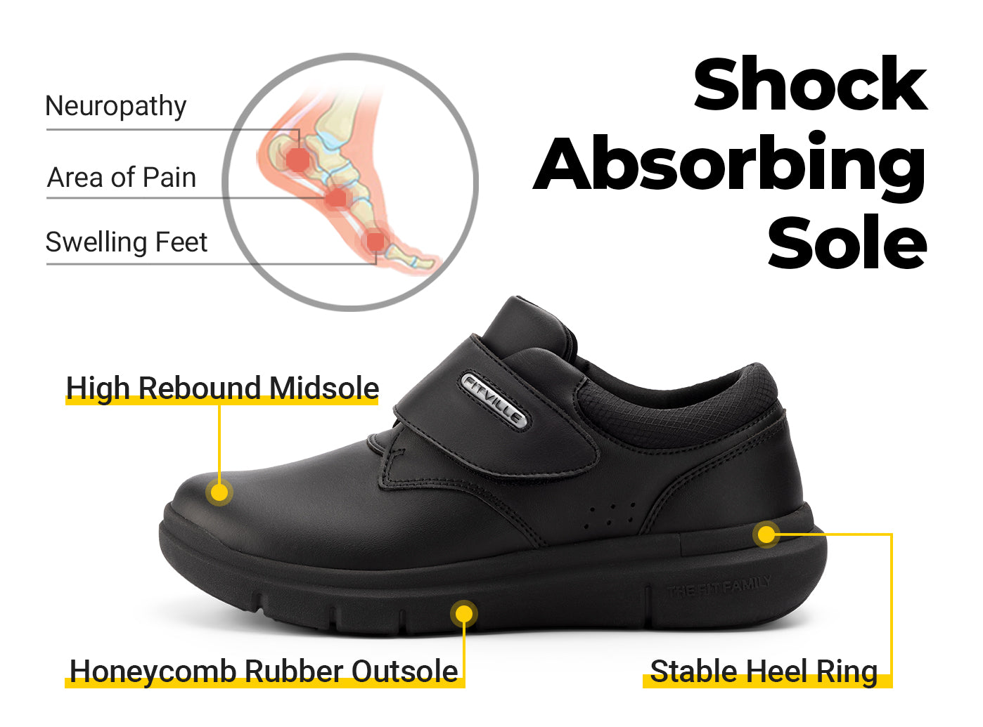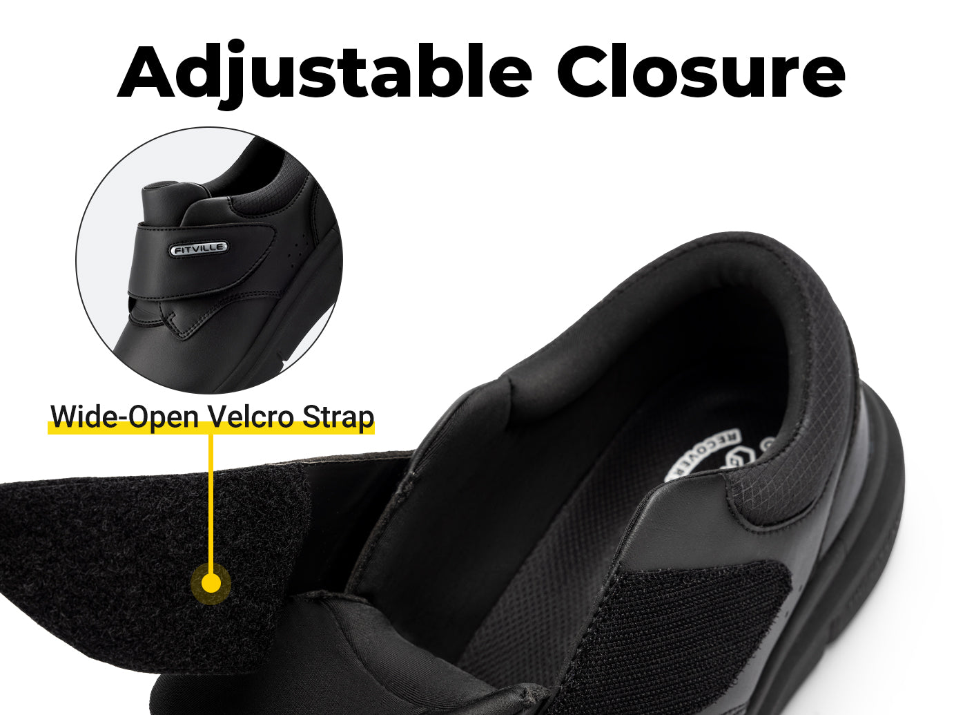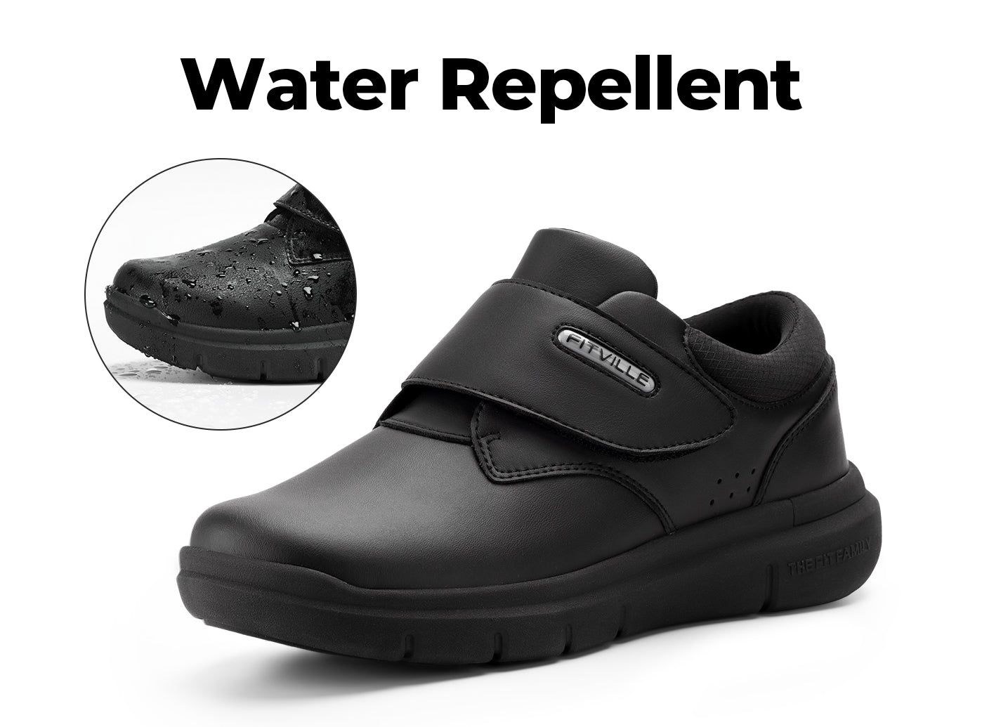 Introducing the latest addition to the EasyTop line, FitVille EasyTop Deluxe Dress Shoes, a premium casual shoe with a vegan leather upper finish. Our shoes are specially crafted to meet the unique needs of those with diabetes, ensuring both style and functionality. It comes with a wide-toe box, high instep and Velcro strap closure to accommodate wider feet and reduce pressure on sensitive feet. The seamless interior is made with spandex with soft foam padding delivering cushioning and protection for sensitive feet, providing all-day comfort. OrthoLite® breathable insole promotes air circulation with superb cushioning and shock absorption. The slip-resistant sole provides extra safety and stability on slippery floors or uneven terrains.