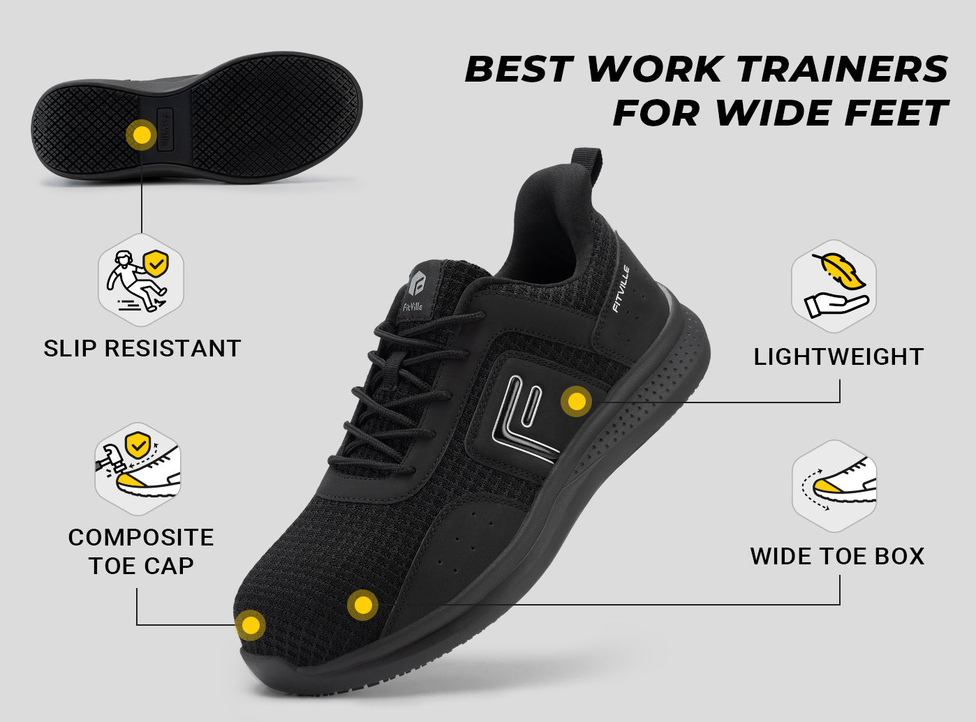 Composite toe sneakers doesn't have to be heavy and bulky. FitVille TitanToe Composite Toe sneakers feature a lightweight and breathable knit upper for all-day cooling comfort. It comes in both wide and extra wide solid composite toe box material, allowing your toes to move freely. It also features a Slip-resistant criss-cross rubber outsole to keep you safe and sound under any circumstances. The brand-new athletic design makes this the perfect shoe for work and the streets.