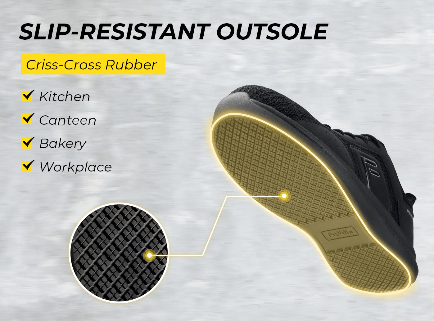Slip-resistant criss-cross rubber outsole minimizes the risk of unexpected slips and falls