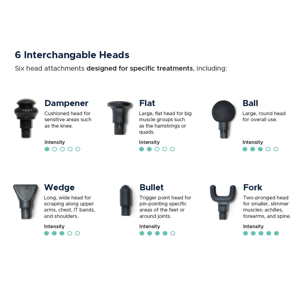 *6 INTERCHANGEABLE MASSAGE HEADS - Six massage head attachments designed for specific treatments, including: Dampener, Flat, Ball, Wedge, Bullet, and Fork heads.