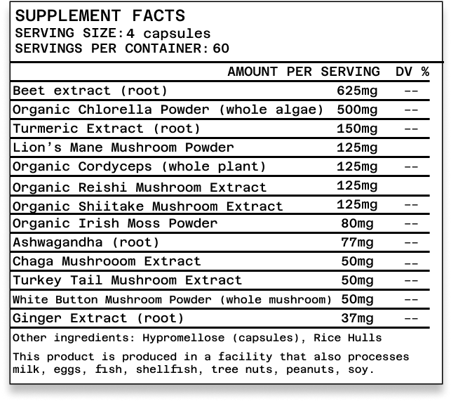 beets, greens, shrooms, ashwagandha, ginger, + turmeric. you're either using 7 different pill and powder products to get this nutrition, or you're running on fumes.