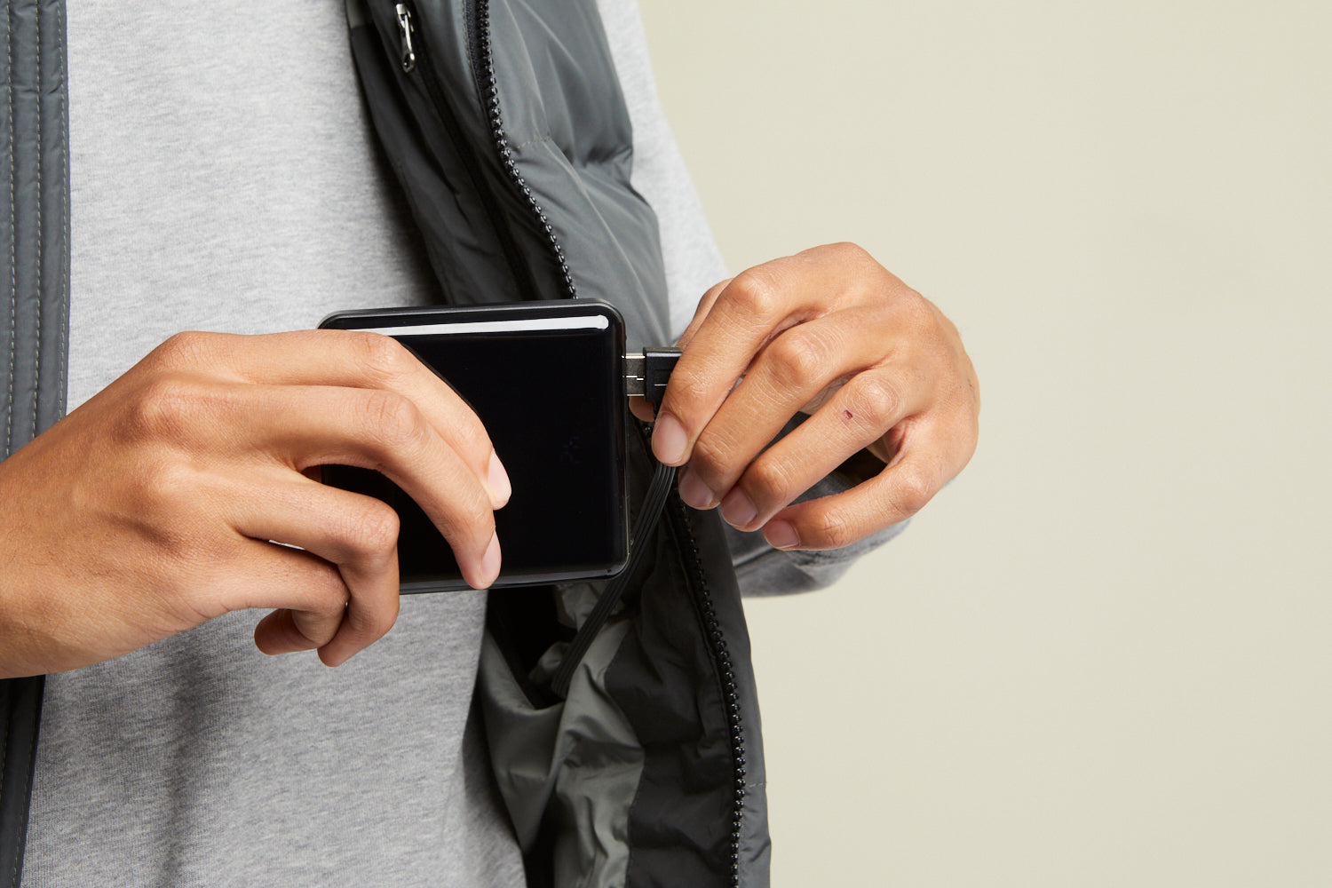 The latest generation of our power technology, designed to keep you warm all day. With the PWR5 plugged in, you will never leave home without a source of energy to power your jacket or mobile devices. This power bank is the fastest charging battery we have ever developed and optimally designed to be used with the following Kelvin coats: Sol, Appollo, Nova, Luna, Aura, and Phantom